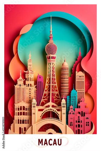 © Anastasiia, Fototapeta premium Macau city poster in papercut, cut out style image. Layered creative skyline picture for travel booklet, postcard, print, cover with landmarks, casinos, hotels