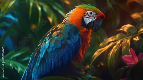 © akun, Obraz premium Macaw Perched Jungle Leaf Background