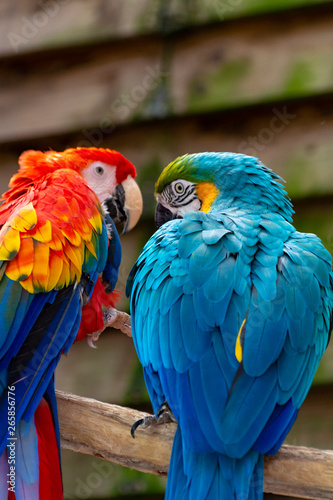 Obraz premium Macaw scarlet and blue-and-yellow parrots, long-tailed colorful exotic birds
