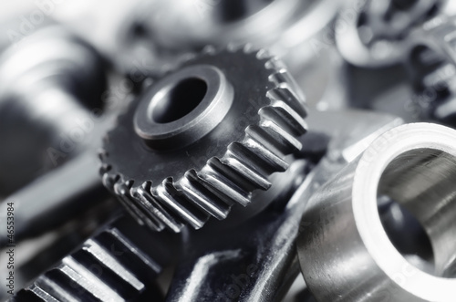 © tycoon101, Fototapeta premium Machine gear, metal cogwheels, nuts and bolts