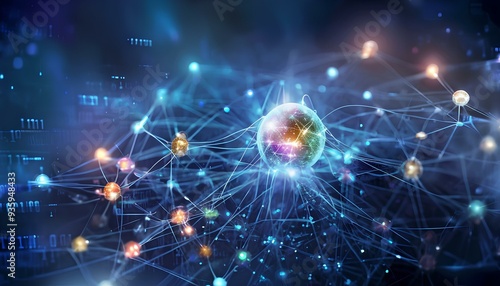 © ridhalex, Obraz premium Machine learning, Central glowing core intelligence of the machine, Radiating out from sphere, , luminous threads connect to various nodes, representing different data points, algorithms, and patterns
