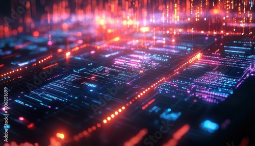 © Nawarit, Obraz premium Machine learning visualization with vibrant data points, sleek digital interface, futuristic lighting, high-tech atmosphere