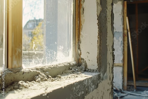 © Georgy, Obraz premium Machine plastering using a plastering pump that automatically sprays the plaster application