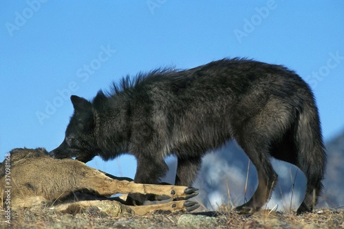 Naklejka premium Mackenzie Valley Wolf, canis lupus mackenzii, Adult with a Kill, a Carcass of Wapiti, Canada