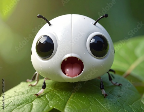 © dian, Obraz premium Macro cartoon ladybug with enlarged head, bulging eyes, and a cute mouth with a shocked expression
