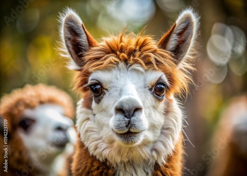 © Arnada, Fototapeta premium Macro Close-up of Brown and White Alpaca Head, Fluffy Alpaca Fur Texture