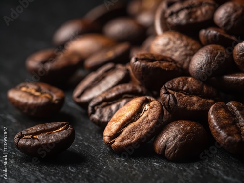 © Sirinporn, Naklejka premium Macro Close-up of Dark Roasted Coffee Beans on Black Background - Rich Texture and Detail