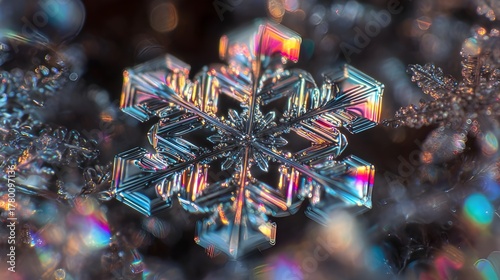 © lil, Naklejka premium Macro Close-up of Iridescent Snowflake Crystal Structure with Rainbow Light