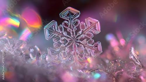 Obraz premium Macro Close-up of Iridescent Snowflake Crystal with Vibrant Pink and Purple Hues