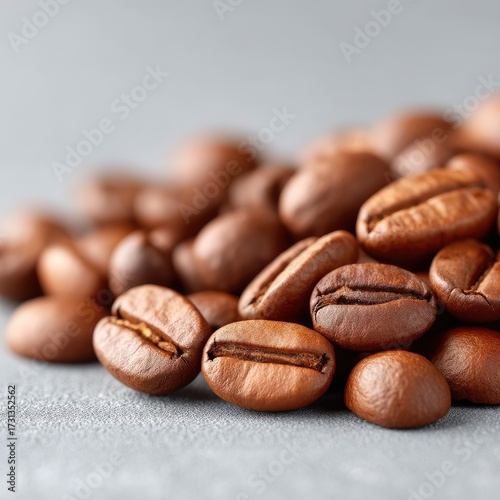 © Irawan, Naklejka premium Macro Close Up of Roasted Coffee Beans on Gray Surface Cinematic Lighting