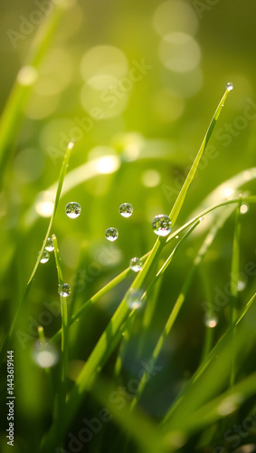 Fototapeta premium <Macro Close-Up Photography of Vibrant Dewdrops on Fresh Green Grass Blades in Morning Sunlight – Embrace Nature's Tranquil Harmony and Rejuvenation>