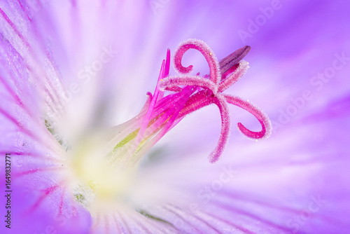© Thomas, Naklejka premium Macro closeup of Geranium Rozanne flower showing pink stamens and curled stigma