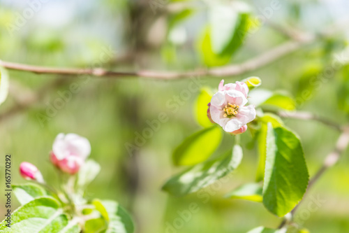 Obraz premium Macro closeup of white and pink apple blossoms growing on tree
