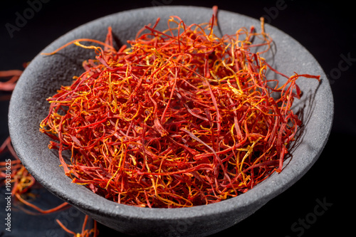 © barmalini, Fototapeta premium Macro collection, expensive real dried red saffron spice close up on black