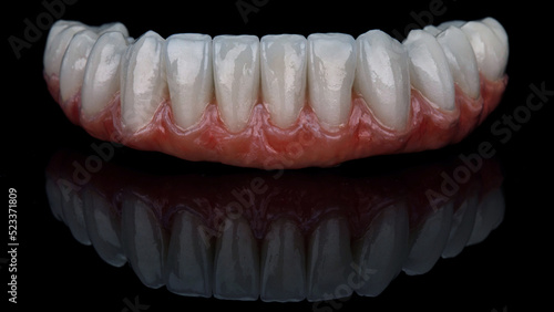 © Dental Pro Content, Fototapeta premium macro dental photo of lower jaw prosthesis on black glass with creative reflection
