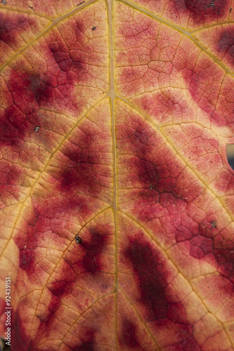 © nnerto, Obraz premium Macro di una foglia di vite rossa e gialla in autunno. Texture organica.