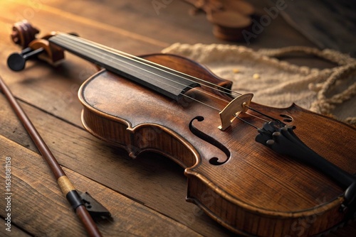© Hamidkamboh, Fototapeta premium Macro Fine Art Photograph of Violin Strings and Bridge – Warm Textured Close-Up