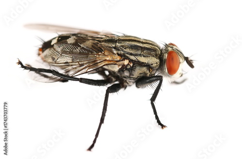 © dule964, Naklejka premium Macro fly, housefly insect, blow flies isolated on white background, side view