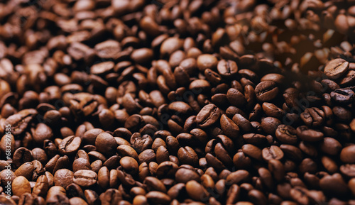 © Parilov, Fototapeta premium Macro fresh brown roasting coffee beans, warm light toning dark background