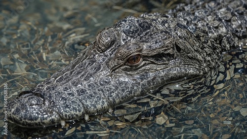 © The 2R Artificiality, Obraz premium Macro image highlighting the textured armored body of a rare, dark-colored alligator species.
