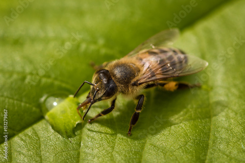 Fototapeta premium Macro image of a bee on a leaf drinking a honey drop from a hive