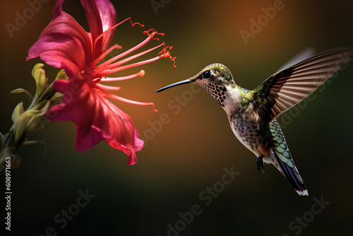 © Stock Rocket, Naklejka premium Macro image of a hummingbird feeding nectar from a flower.
