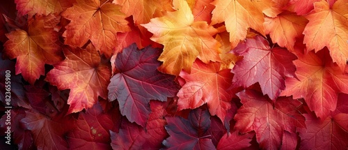 © Suradet Rakha, Obraz premium Macro image of a lively maple leaf. Bright red to yellow gradient