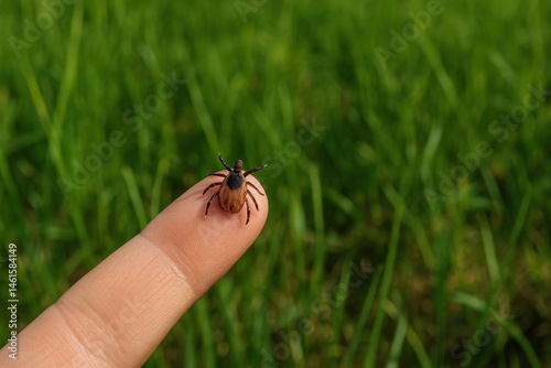 Obraz premium Macro image of a tick on a human finger with green grass background, illustrating danger of tick bites outdoors.