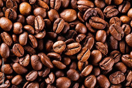 © Mayatnikstudio, Naklejka premium Macro image of brown roasted coffee beans background.