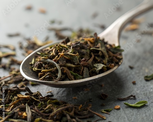 Fototapeta premium Macro image of dried tea leaves on a spoon