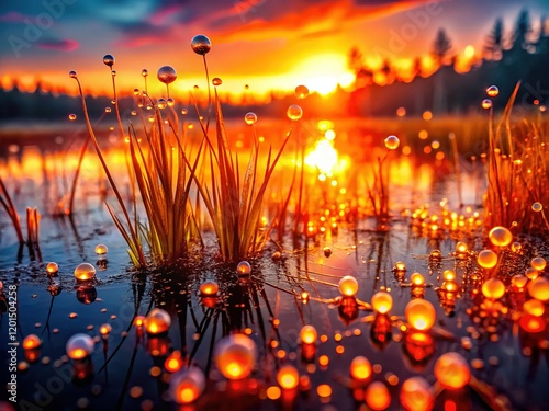© Wanlop, Obraz premium Macro Marsh: Vibrant Light Flares & Colorful Molecular Motion
