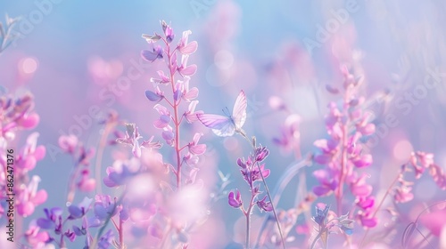 Naklejka premium Macro nature landscape chamomile, purple peas, butterfly in morning haze with cool blue tones