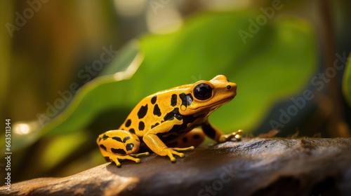 Fototapeta premium macro of a yellow poison dart frog sitting in a tropical rainforest