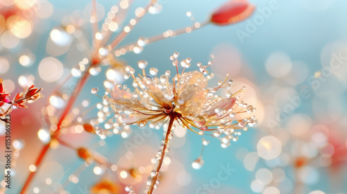 Fototapeta premium Macro of Beautiful blooming dandelion seeds parachute flower petal with water dew drops and splash atmosphere after rain