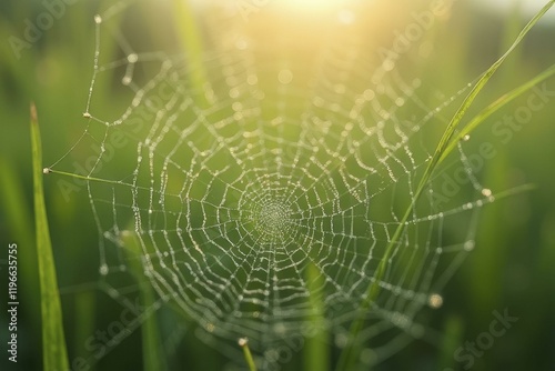 © Anarkali Art, Naklejka premium Macro of dew on spiderweb with soft bokeh of grass background