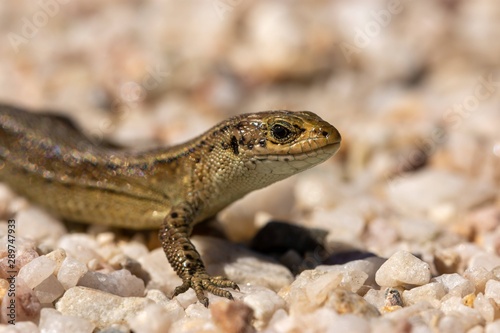 Naklejka premium Macro of the viviparous lizard, Zootoca vivipara, lacerta vivipara on gravel