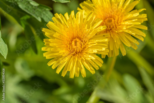 Fototapeta premium macro of yellow dandelion weeds in lawn