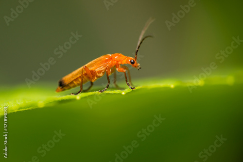 Fototapeta premium Macro photo. Firefighter beetle on green leaf