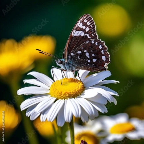 © QuantumMuse, Fototapeta premium Macro photo of a pigeon butterfly sitting on a daisy