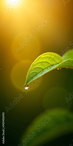 © Jelly, Fototapeta premium Macro Photo of Fresh Green Leaf with Single Clear Water Droplet on Tip – Natural Light, Soft Bokeh Background, Ideal for Eco-Friendly Visuals, Wellness Branding, and Nature Photography