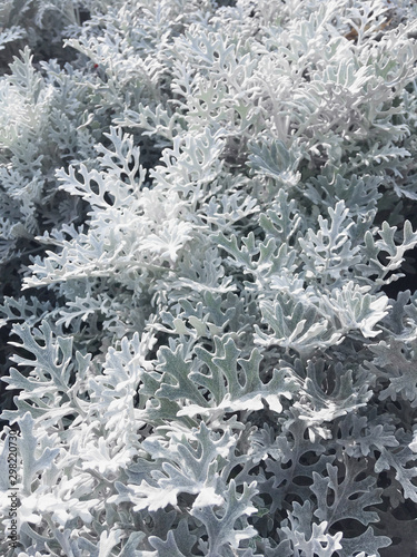 Fototapeta premium Macro photo of silver ragwort (formerly known as Senecio cineraria or Jacobaea maritima). Close up photo of plant leaves.