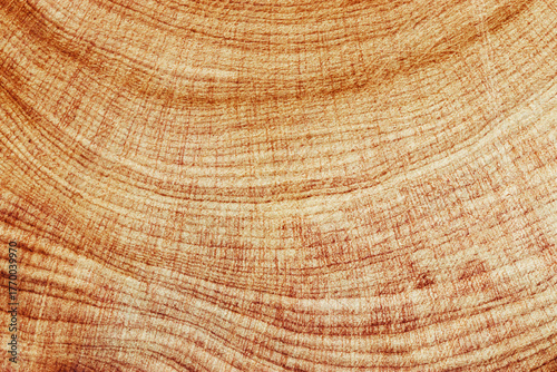 © yrabota, Naklejka premium Macro photo of wood timber of juniper tree rings, natural geometric pattern, abstract nature background. Natural wooden organic textures, monochrome brown beige gradient color, earthy tones, above