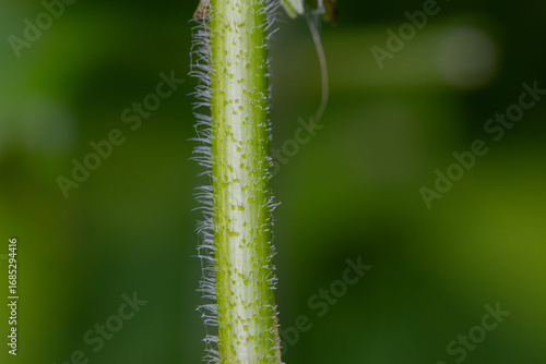 Naklejka premium Macro photograph of the stem of a green plant with small soft needles, Neveta...