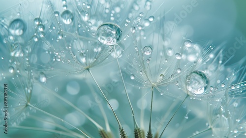 © TheWaterMeloonProjec, Naklejka premium Macro photography Dew drops on dandelion seed with soft background and water drops on dandelion
