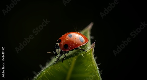 © inst, Fototapeta premium Macro Photography of a Ladybug on a Dew-Kissed Leaf Against a Dark Background