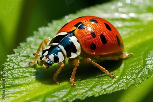 © Aimi, Naklejka premium Macro photography of a ladybug on a green leaf, capturing the texture of its shell and tiny details.