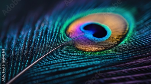 Naklejka premium Macro photography of a single peacock feather, iridescent eye pattern