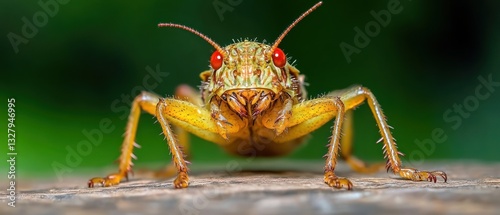 © Solikah, Naklejka premium Macro Photography of a Striking Yellow Katydid with Vibrant Red Eyes