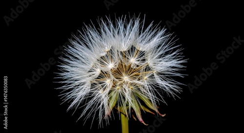 Fototapeta premium Macro photography of a white dandelion seed head on a black background,...