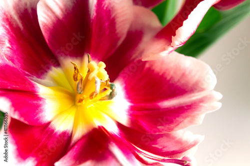 © Natali Mali, Fototapeta premium Macro photography of a white-pink tulip, stamens close-up. Selective focus.